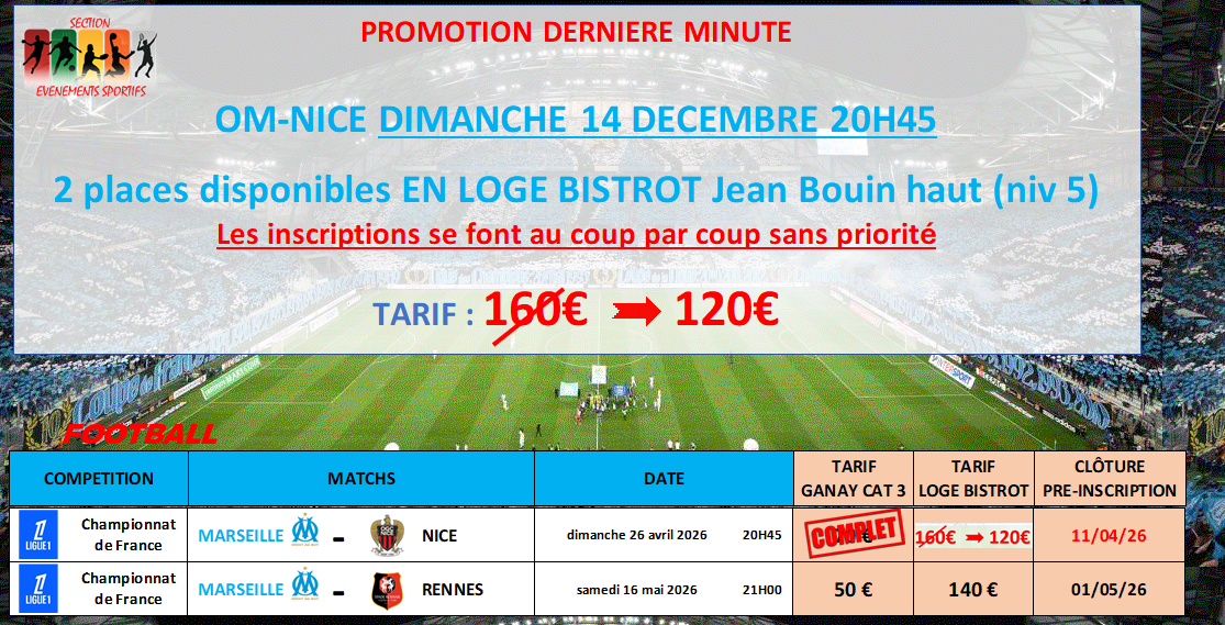 PROMOTION DERNIERE MINUTE PLACE DISPONIBLE EN LOGE OM-NICE dim 26 avril 20h45